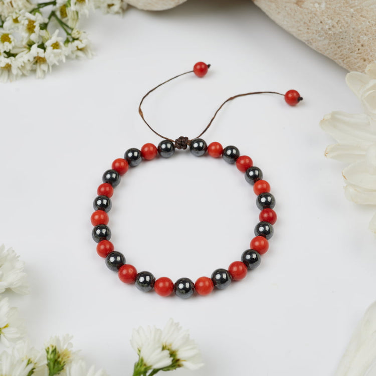 Ce bracelet combine les propriétés de l'Hématite et du Corail pour offrir ancrage, force, protection et vitalité. Il favorise également la concentration et le courage pour affronter de nouvelles aventures.